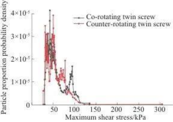 El esfuerzo cortante máximo experimentado por la partícula trazadora indica el proceso de corte que sufre la partícula trazadora durante el proceso de extrusión de doble tornillo. Cuanto mayor sea la proporción de partículas trazadoras que experimenten un alto cizallamiento, mejor será el efecto de dispersión del tornillo.
