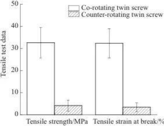 La resistencia a la tracción y la tensión de rotura en el momento de la rotura de las estrías del material extruidas mediante extrusión de doble tornillo corrotativo fueron ligeramente superiores a las extruidas mediante extrusión de doble tornillo contrarrotativo.