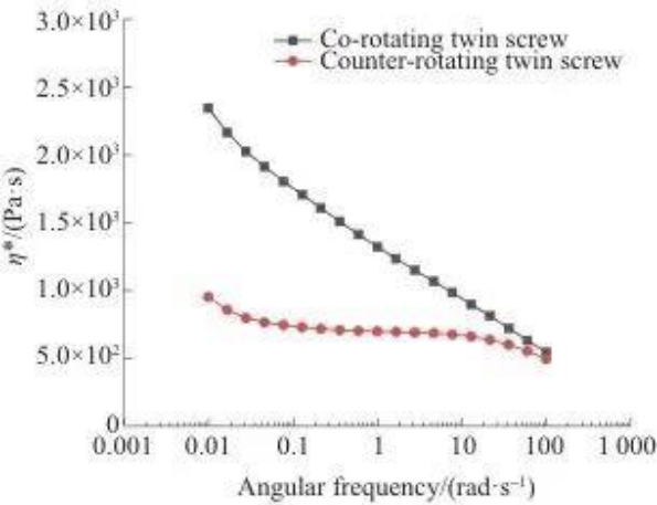 Debido a la diferencia estructural, el doble tornillo contrarrotativo tiene una mayor capacidad de dispersión y mezcla, y la cadena molecular se rompe más completamente. Por lo tanto, el η* del material extruido por el doble tornillo contrarrotativo es menor que el del doble tornillo co-rotativo.