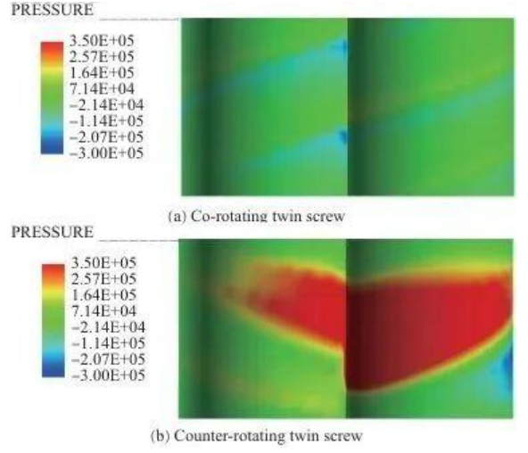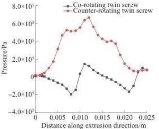 En la extrusión de doble tornillo contrarrotativo, la presión en el corredor primero aumenta y luego disminuye a lo largo de la dirección de extrusión, y se produce una alta presión local en la posición media. Con referencia a la estructura del ajuste de doble tornillo contrarrotativo (Figura 5), se encuentra que la alta presión local se produce en el punto de engrane a lo largo del centro de la dirección de extrusión. Esto se debe a que los dos tornillos giran en direcciones opuestas y el flujo de material es desigual o bloqueado durante el proceso de extrusión, que se acumula en la posición media y luego forma una alta presión local en el canal.