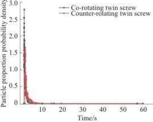 En el doble tornillo co-rotativo, la mayoría de las partículas se concentran entre 1,00 y 1,99 segundos, y en el doble tornillo contrarrotativo, la mayoría de las partículas se concentran entre 1,48 y 2,97 segundos. La curva correspondiente del doble tornillo co-rotativo está más a la izquierda y el pico es más alto, lo que indica que la capacidad de transporte del doble tornillo co-rotativo es más fuerte. La razón de este fenómeno puede ser que durante el proceso de extrusión de doble tornillo co-rotativo, el material es transportado a la fuerza a lo largo de una trayectoria en forma de "∞" por el tornillo.