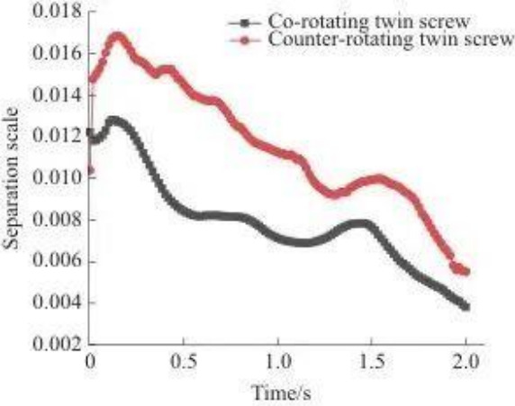 Las escalas de separación caracterizan los procesos de mezcla distribuida. La Figura 13 muestra la curva de escala de separación. En el momento inicial, las dos partículas están a ambos lados de la entrada, por lo que el valor de la escala de separación es grande. A medida que aumenta el tiempo, la escala de separación disminuye bajo el efecto de mezcla del tornillo, la curva cae, el grado de mezcla de distribución de las partículas superficiales se profundiza gradualmente y hay un fenómeno de fluctuación durante el proceso, que es causado por la agregación de partículas durante el proceso de flujo.