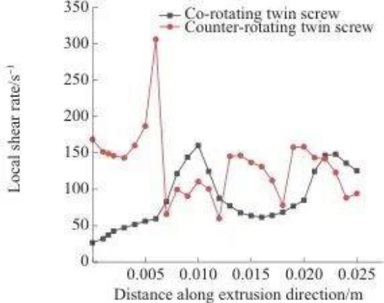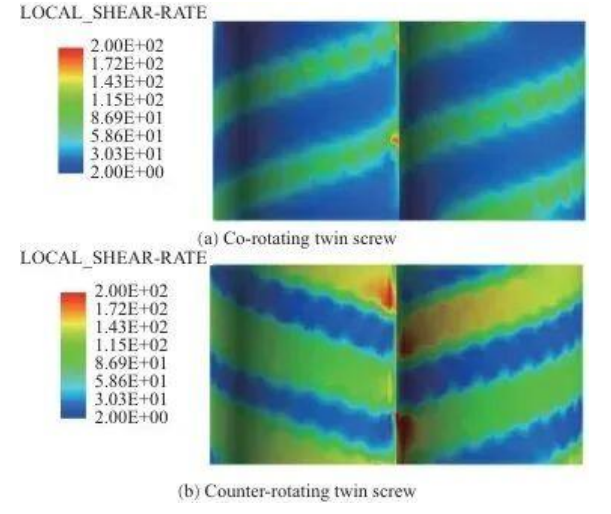Tanto en la extrusión de doble tornillo co-rotante como en la extrusión de doble tornillo contra-rotación, la velocidad de corte es mayor en la cresta del tornillo y menor en la ranura del tornillo. La razón de este fenómeno es que el material fluye más rápido en los espacios estrechos y el espacio entre las crestas del tornillo y la pared interior del cilindro es más pequeño, por lo que la velocidad de corte es mayor, mientras que el espacio entre las ranuras del tornillo y la pared interna del cilindro es mayor, por lo que la velocidad de corte es menor.