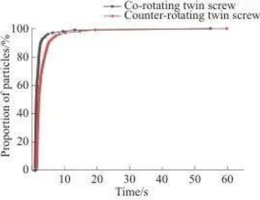 La curva de distribución del tiempo de permanencia acumulativo del doble tornillo co-rotativo está por encima del tiempo de permanencia acumulativo del doble tornillo co-rotativo, y una curva más alta indica que más partículas fluyen fuera del canal en un momento dado.