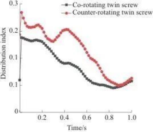 Los índices de distribución describen las propiedades reológicas y el comportamiento de flujo de los materiales extruidos. Se puede ver en la curva del índice de distribución (Figura 12) que la uniformidad de distribución del doble tornillo contrarrotativo es mejor que la del doble tornillo corotativo.